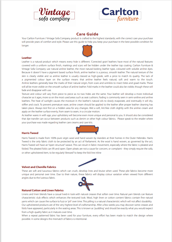 Your Carlton Furniture / Vintage Sofa Company product is crafted to the highest standards; with the correct care your purchase will provide years of comfort and style.